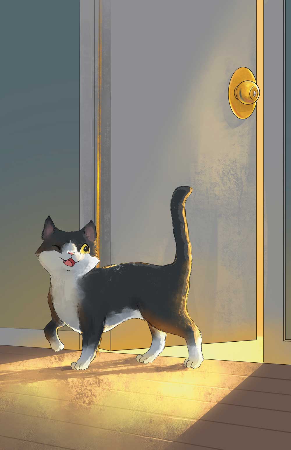 Then something exciting happens. In her toy cupboard, Emma finds an old wand she once made at school. Pretending to be a wizard casting spells, she discovers that the wand really works! It turns her cat, Penny, into a girl. Now Penny says she knows all about magic. Her mum knew a cat who knew a witch’s cat, you see. She thinks being a girl will be fun, but she is still a cat inside and only remembers spells that would be useful to cats.